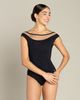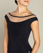 Collant adulto confeccionado em amni, com detalhe em tule acima do busto que confere leveza e sofisticação ao visual. Nas costas, o drapeado cria um efeito delicado e elegante, valorizando a silhueta. O tecido em amni oferece conforto, elasticidade, proteção UV e toque macio, ideal para aulas, ensaios e apresentações.
