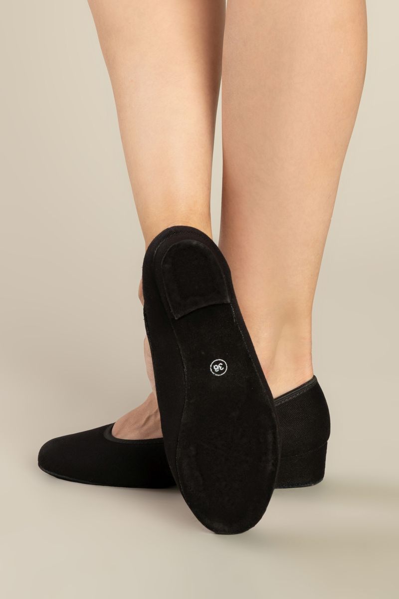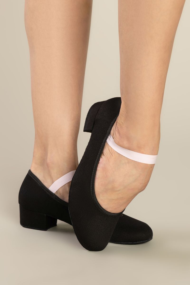 Sapato em lona com elástico sobre o peito do pé, oferecendo ajuste firme e confortável. Disponível nas alturas de salto 2 cm ou 3,5 cm, sendo ideal para exames e apresentações como o Royal Academy of Dance. Sua sola em camurça natural proporciona melhor deslizamento e controle nos movimentos. Uma escolha leve, prática e com excelente desempenho para bailarinos que buscam segurança e mobilidade.